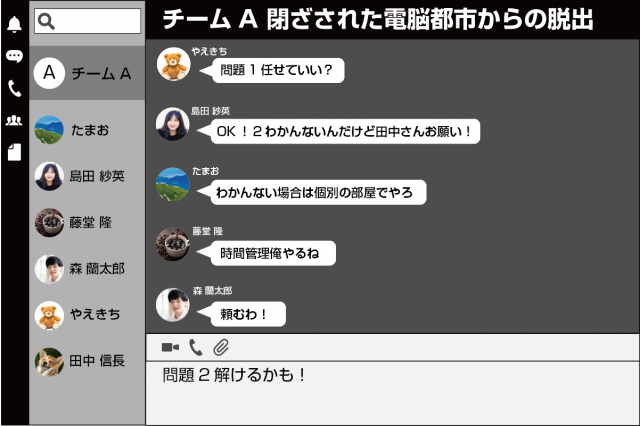 仲間と協力して謎を解きある空間からの脱出を目指す株式会社IKUSAの企業向けイベント「謎解き脱出ゲーム」をオンライン向けにアレンジしたものになります。参加者はビデオチャットを使い、仲間との謎解きを自宅からオンラインで楽しむことができます。