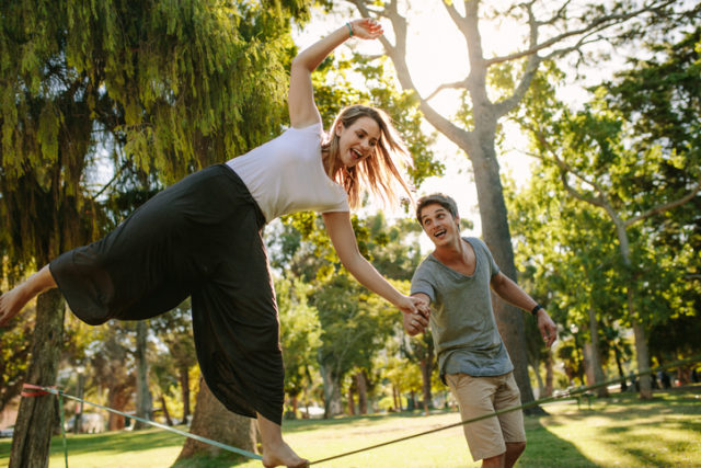 スラックラインは、しっかりと張られたベルトの上で立ったり、ポーズを取ったりして、バランスを楽しむニュースポーツ。上達すればアクロバティックなパフォーマンスをしたり、ベルトの上でヨガをすることもできます。バランス感覚と体幹が養えることから、他競技のプロアスリートのトレーニングとしても取り入れられています。