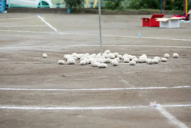 床に置かれた低いカゴに向かって玉を投げ入れるシンプルな競技。玉の跳ね返りや方向のズレが起きやすく、意外と難易度は高め。