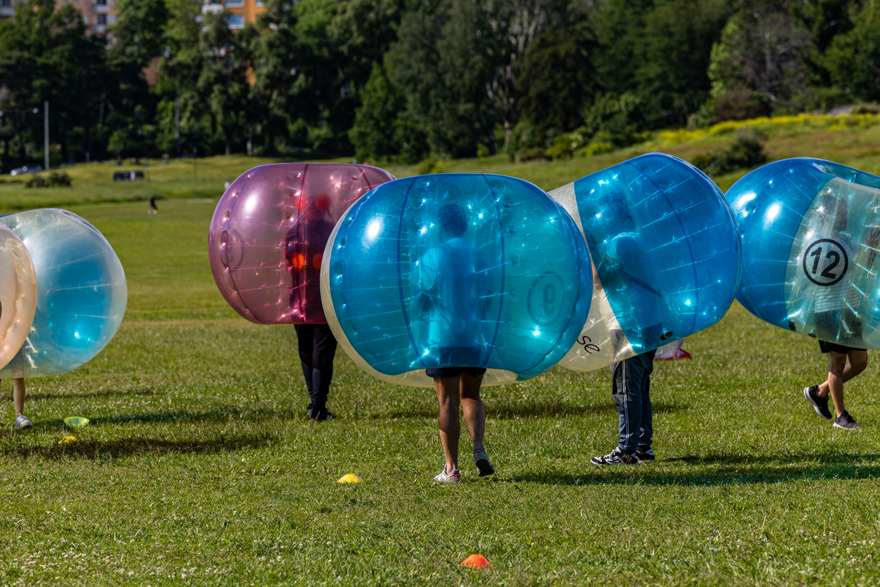 「バブルサッカー」は、体の大部分を覆う柔らかいバブルボールを装着してサッカーをするニュースポーツです。