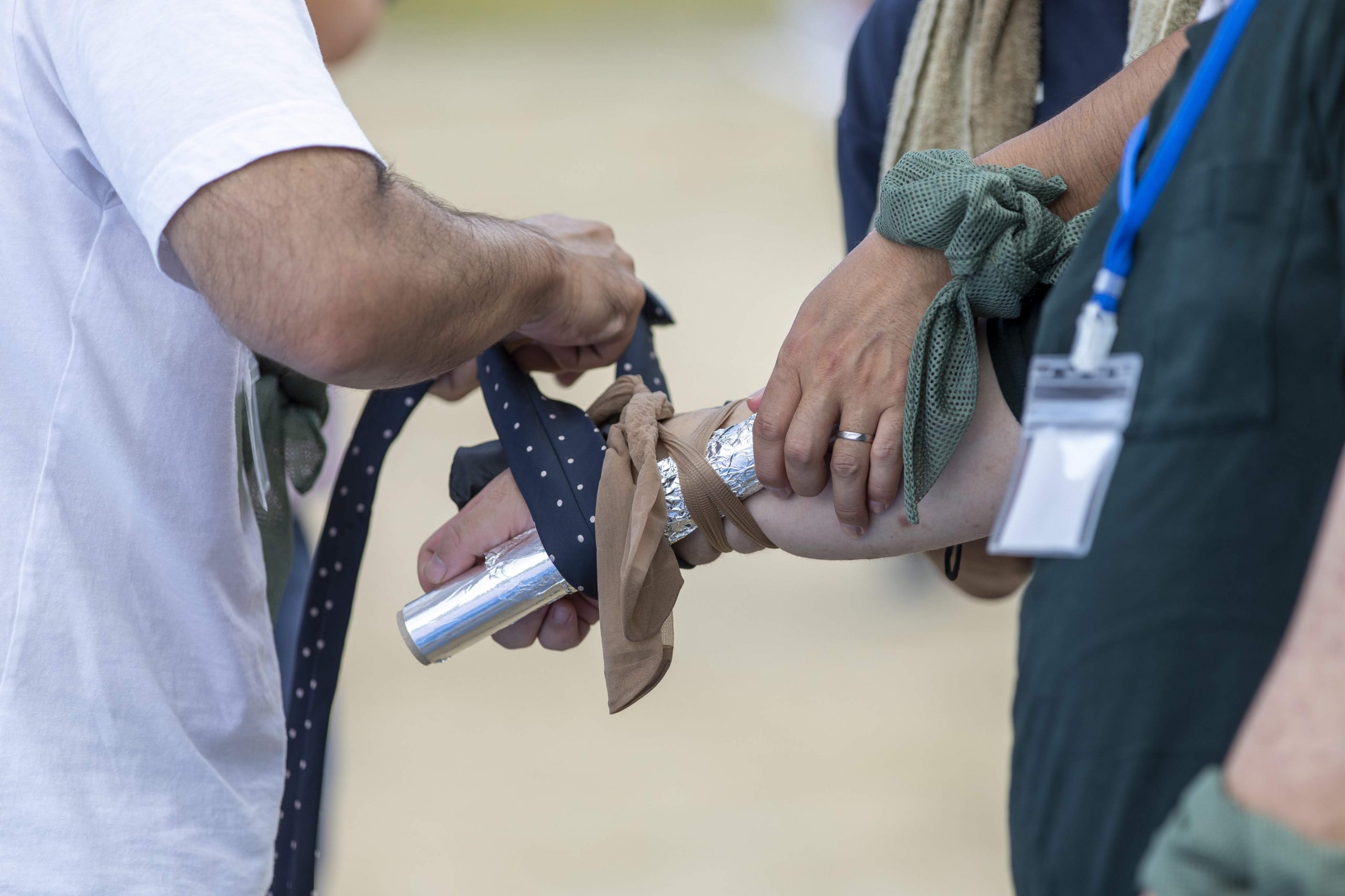 例えば、デモンストレーションで示したお題は「ガラスに触れて手から出血しているのですぐに応急処置をしてください」というもの。身の回りにあるものを使った迅速な対応力が問われる競技です。