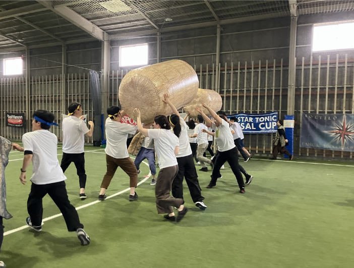 まず始めに行ったのは「大俵送り」!全員で協力して大きな俵を前に送っていくアクティビティです。