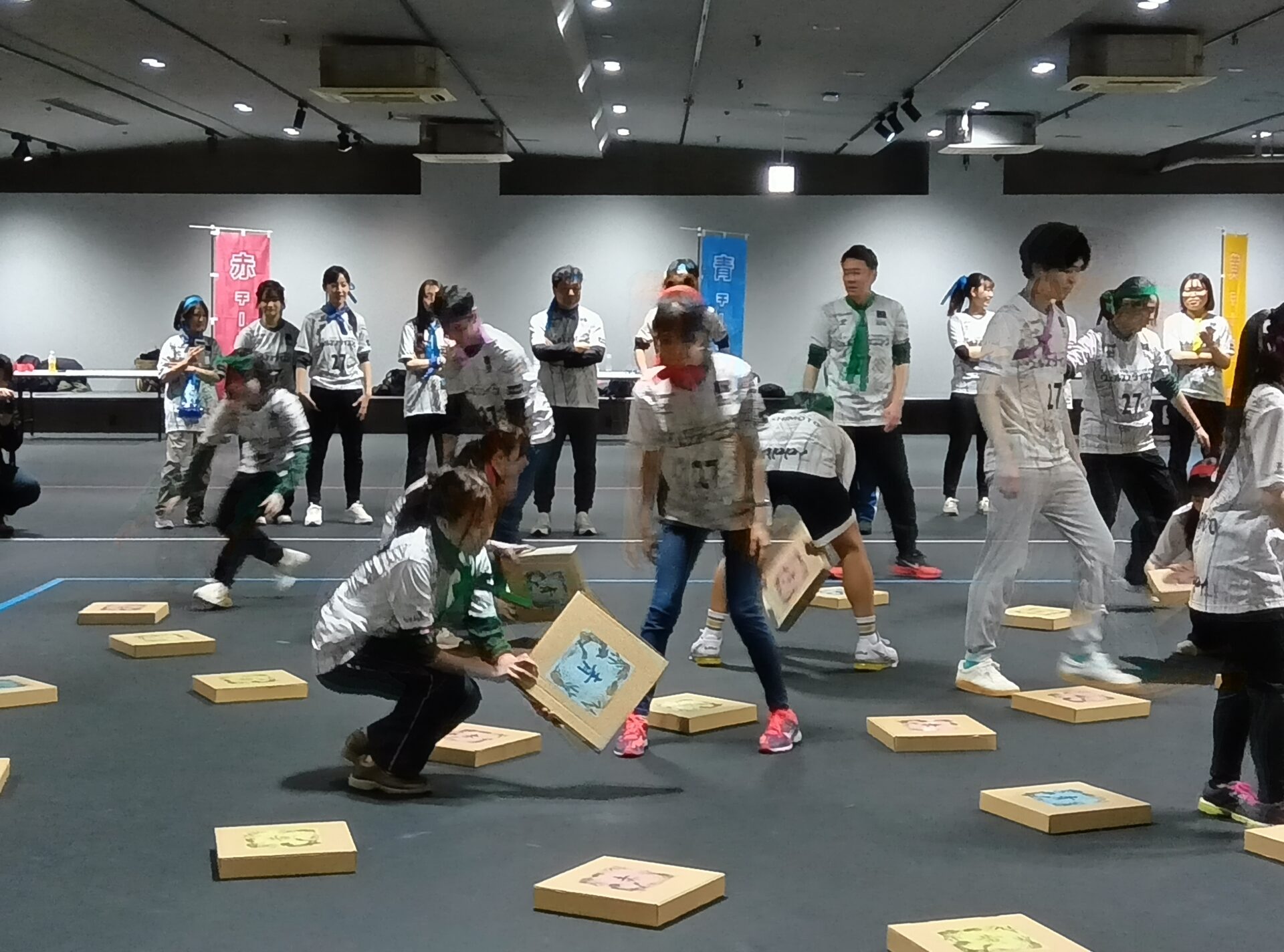 続いての「稲作合戦」は、自チームの決められたカラーが描かれた板が表になるようにひっくり返す競技です。