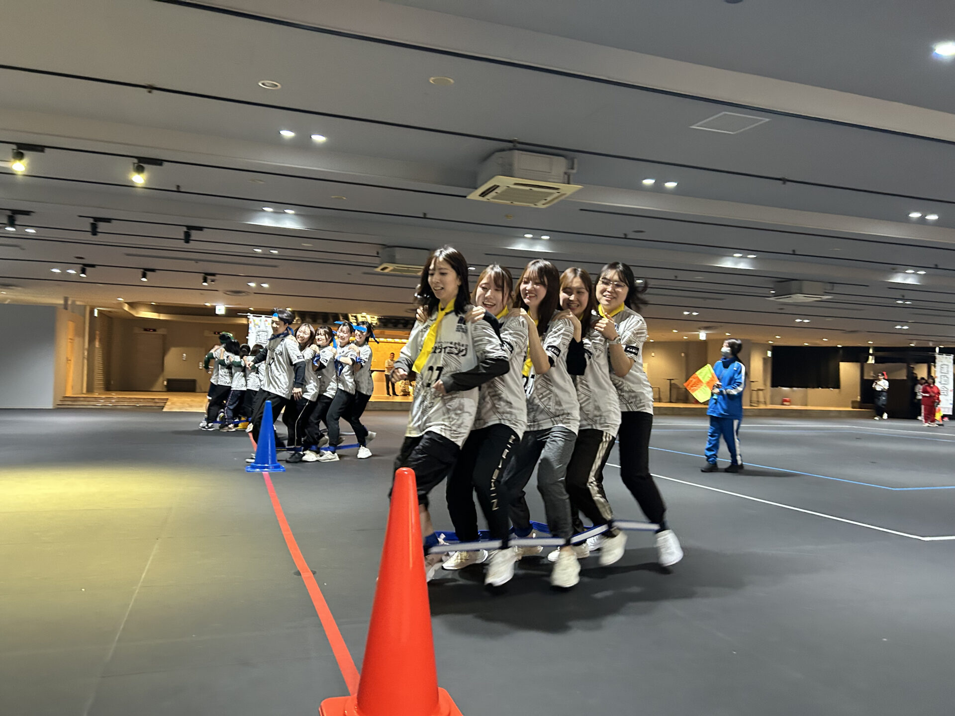 こちらは、チームから5名が出陣し両足にバンドを装着して舞台端に置かれたコーンを回って往復する競技です。チームの結束力が問われます。