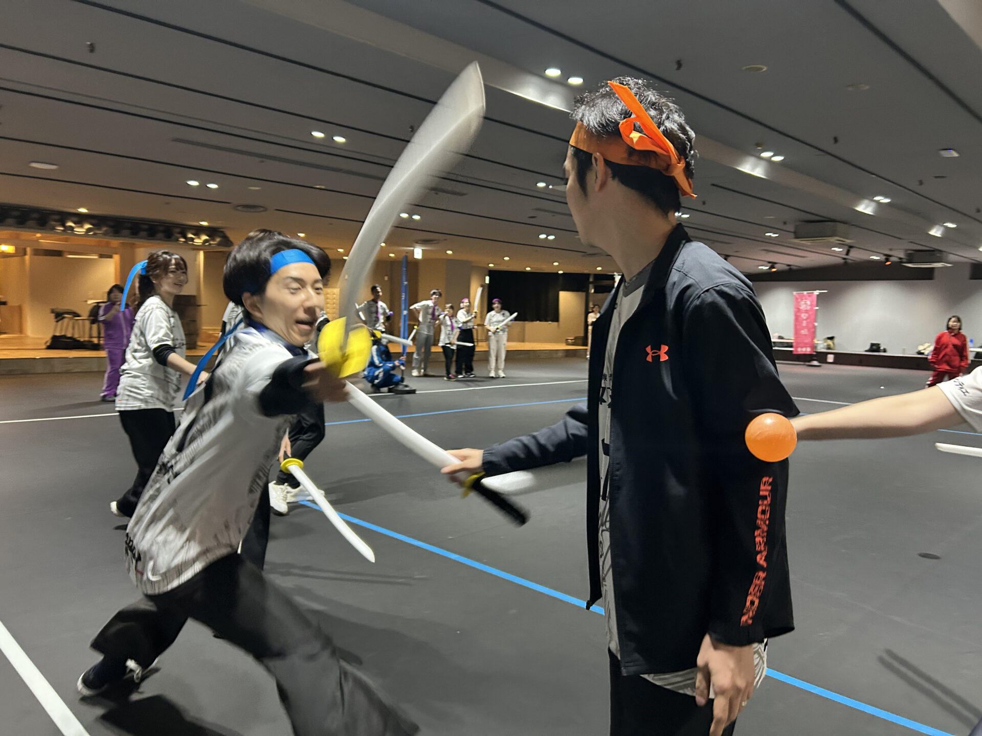 チャンバラ合戦は、腕に「命」と呼ばれるカラーボールをつけ、当たっても痛くないスポンジ製の刀で、相手の「命」を落とす競技です。