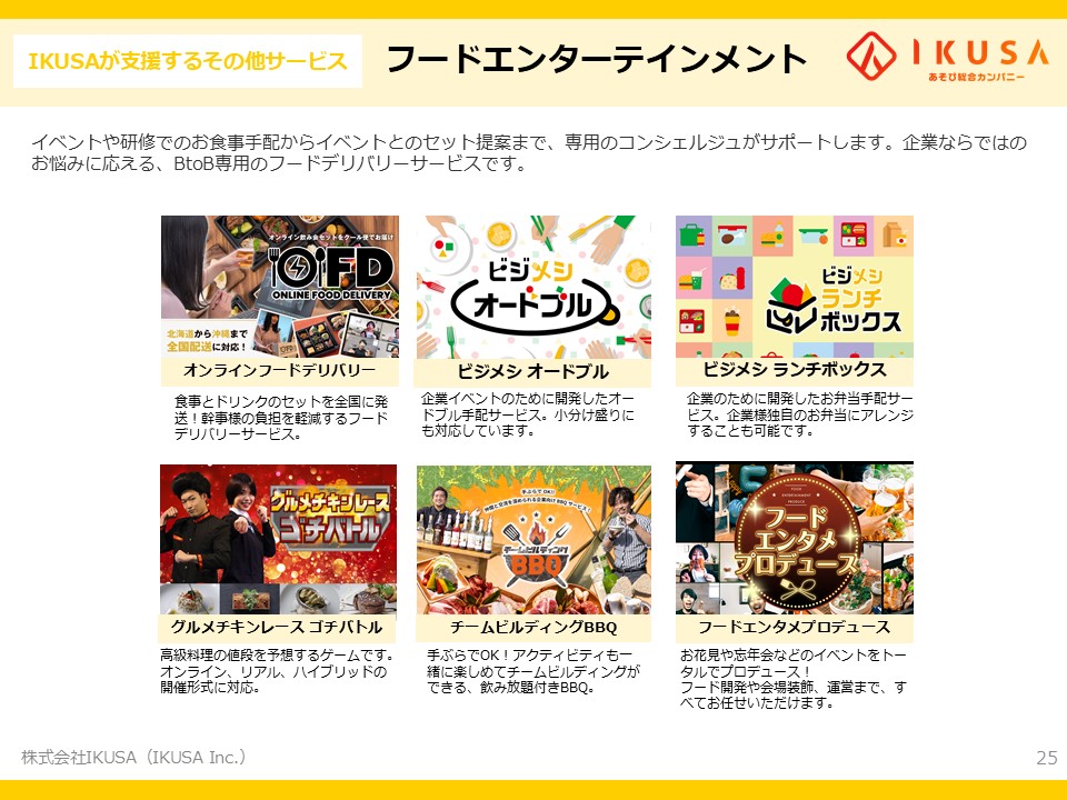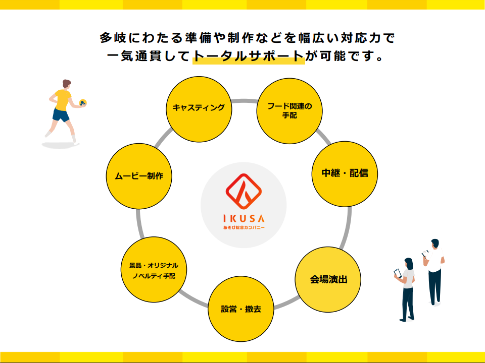 専用のWEBシステムで「リモートでも圧倒的に楽しい運動会」をコンセプトに開発されたチームビルディング型運動会です。チーム全員で力を合わせなければいけない、特徴ある7つの種目からお客様のご要望に合わせて種目の選択が可能です。どこにいてもオンラインで参加できる、オンラインだから楽しい運動会です。