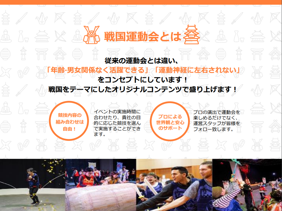 従来の運動会とは違い「年齢・男女関係なく活躍できる」「運動神経に左右されない」をコンセプトにした全く新しい運動会です。チャンバラ合戦を始め、大俵転がしや兵糧入れ、はたまた謎解きゲーム「本能寺からの脱出」まで、戦国をテーマにしたオリジナルコンテンツで盛り上げます!